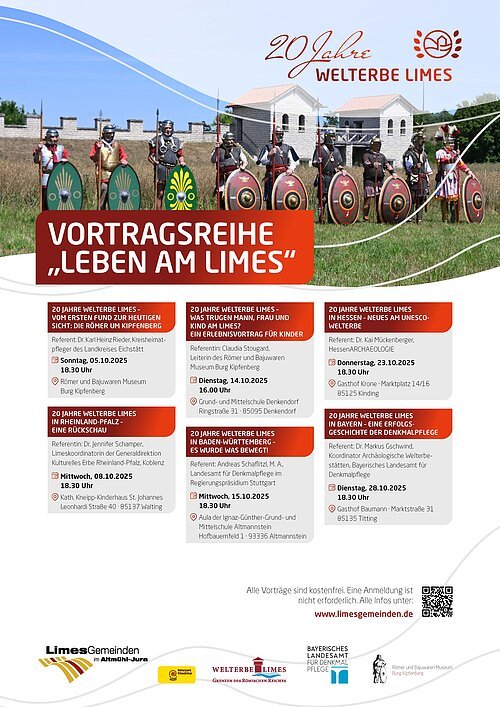 Der Jubiläumsvortrag von Andreas Schaflitzl in Altmannstein zeigt Highlights aus den 164 km Limes in Baden-Württemberg und lässt die letzten 20 Jahre Vermittlung und Forschung Revue passieren.